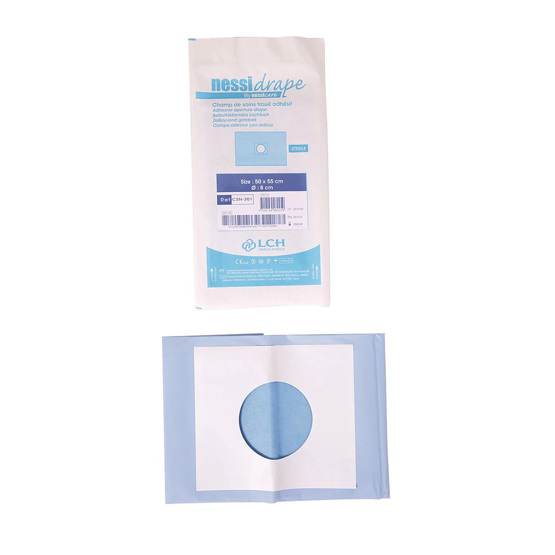 Il se présente sous emballage individuel, à usage unique, et se déplie en drap sur le patient. Doté d’un trou adhésif, de diamètre différent en fonction de la taille du champ, garantissant le positionnement sans risque de glissement du drap. Partie adhésive pour éviter tout glissement.